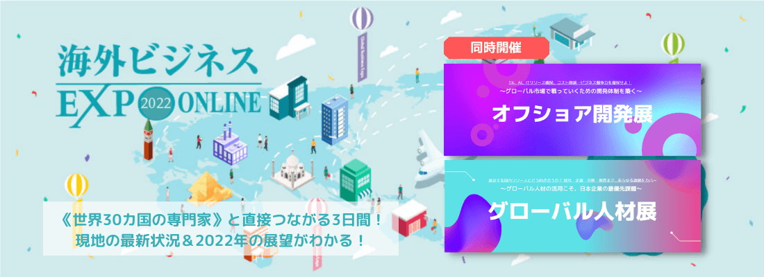 2022年1月25日(火)〜27日(木)の3日間に渡って、『海外ビジネスEXPO2022 オンライン』を開催いたしました。 激動のコロナ禍のトンネルの先が見えつつある現在、日本の「...