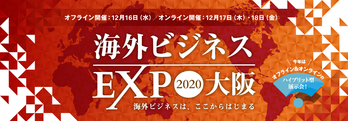 2020年12月17日(木)〜18日(金)の2日間に渡って、『海外ビジネスEXPO2020大阪』を開催いたしました。 さる11月の『海外ビジネスEXPO2020東京』は、オフライン...