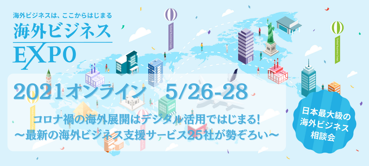 2021年5月26日(水)〜28日(金)の3日間に渡って、『海外ビジネスEXPO2021オンライン』を開催いたしました。 今回は「コロナ禍の海外展開はデジタル活用ではじまる!」と銘...