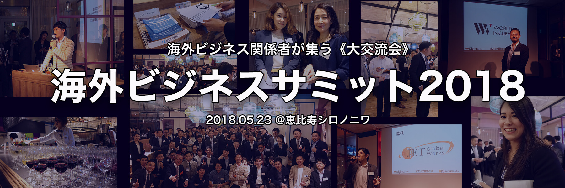 2018年5月23日(水)、東京は恵比寿・シロノニワにて、『海外ビジネスサミット 2018』を開催いたしました。 海外ビジネスの専門家が一堂に介する“大交流会”と銘打った本イベント...