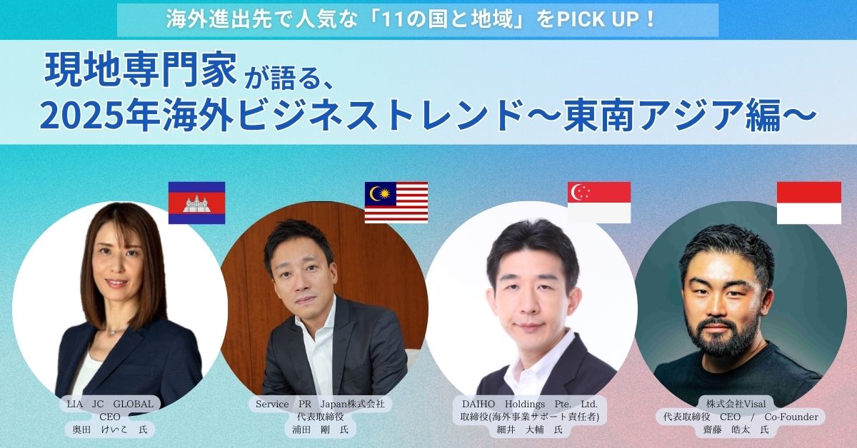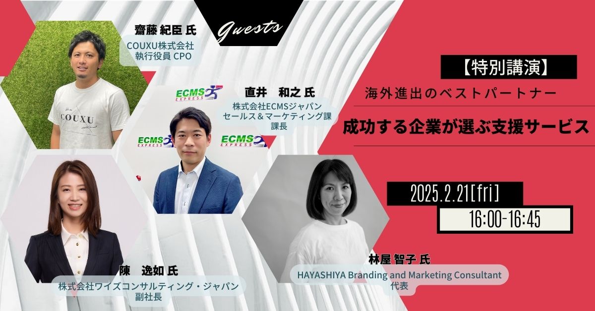 各国の専門家を招き、パネルディスカッション形式で、日替わりでアジア、アメリカ・ヨーロッパ、東南アジア市場をテーマに、各市場の現状分析、2025年のトレンド予測、そして成功事例や教訓を交えながら、海外ビジネスの成功戦略を具体的に解説いたします。