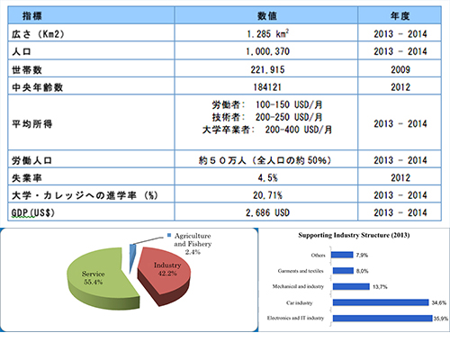 労働人口は約50万人で、産業構成は製造業がおおよそ42%、サービス業が55%、農林水産業がそれ以外となっております。製造業は、自動車産業、電子産業がそれぞれ3分の1ずつを占めています。