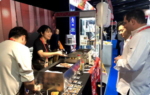 での展示会に出展。現地有名カフェとの引き合いを獲得し、毎月の定期購入の確約に至った。